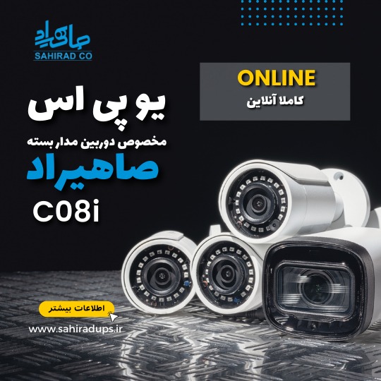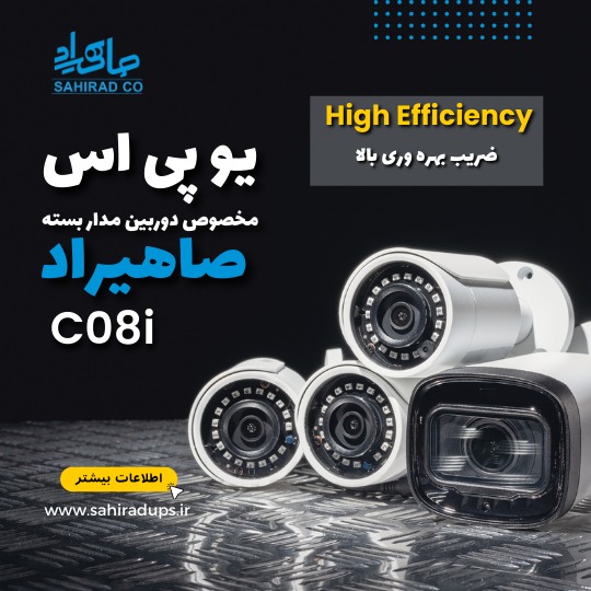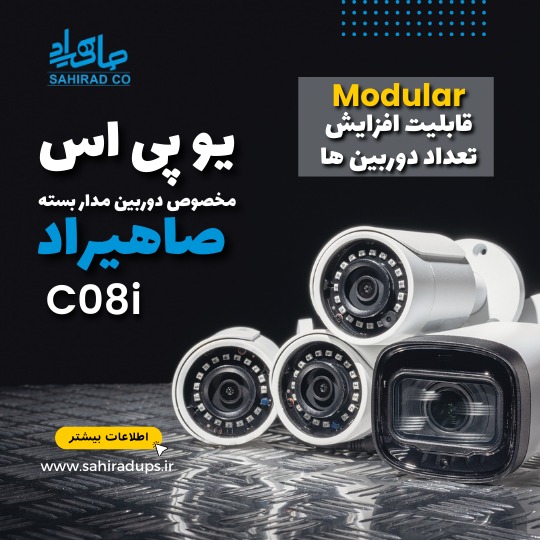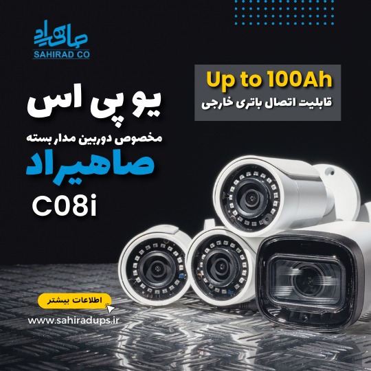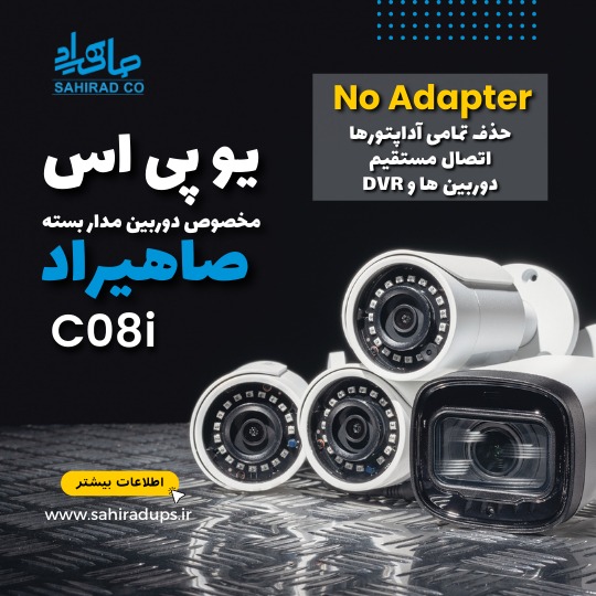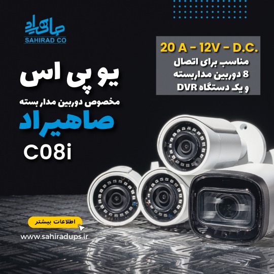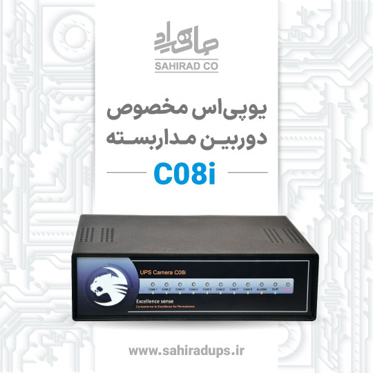 این دستگاه با نام تجاری   SaHirad UPS Camera C08iدارای 10 کانال خروجی به جهت اتصال مستقیم 8 عدد دوربین مداربسته و یک دستگاه DVR و یک دستگاه  Alaram  می باشد. یکی از ویژگی های منحصر به فرد این دستگاه این است که هر دستگاهی که دارای خروجی  12VDC باشد قابلیت اتصال به این دستگاه را داراست، در صورتی که کسب و کارها کمتر از 8 دوربین داشته باشند می توانند دستگاه کارت خوان(pos) و LED خود را برای استفاده بهینه از دستگاه یو پی اس صاهیراد به آن متصل کنند، هم چنین این دتگاه به جهت داشتن 20 آمپر جریان خروجی مدت زمان طولانی تری برق دهی دارد و می توان دستگاه های با توان بالا را به آن متصل نمود.
